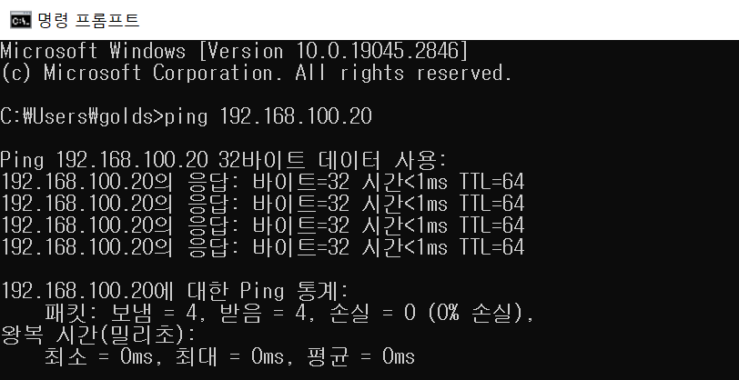 아까 칼리의 ip만 막았기 때문에 cmd에서는 ping이 정상적으로 간다.