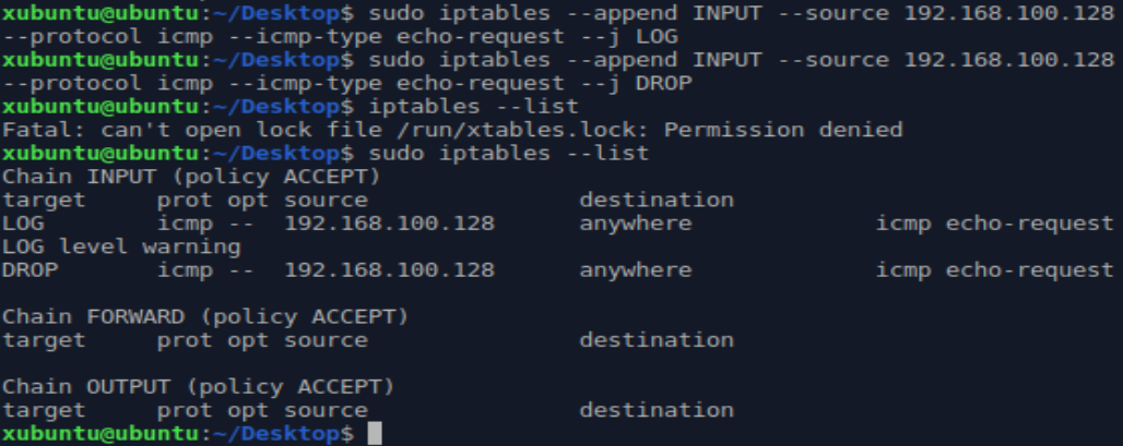 명령어: $ iptables --append INPUT --source [Kali IP] --protocol icmp --icmp-type echo-request --j LOG