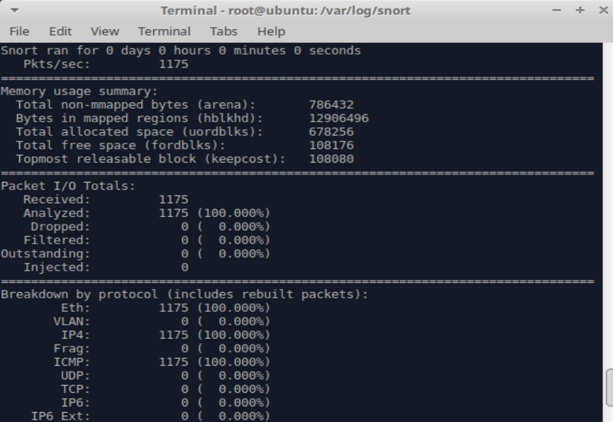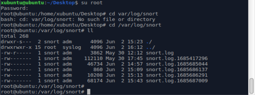 root 로 옮겨서 /var/log/snort 디렉토리로 이동, ll 명령 실행하면 로그 정보 출력