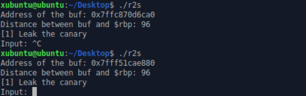 실행 시 버퍼 주소(매번 바뀜), 버퍼와 rbp 사이의 거리 출력