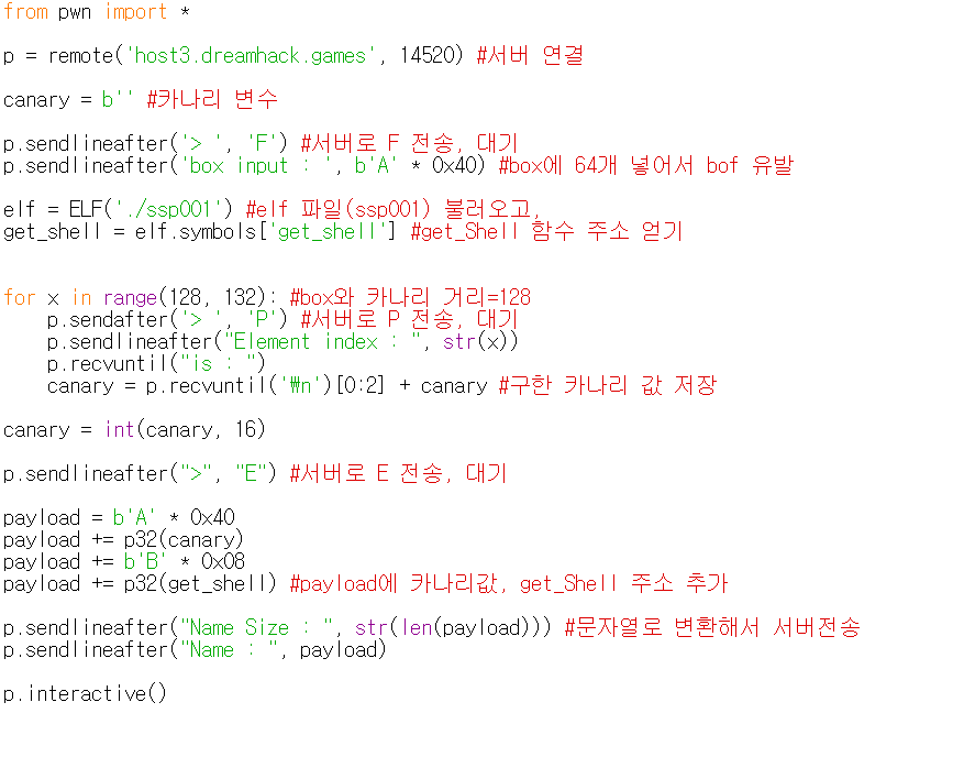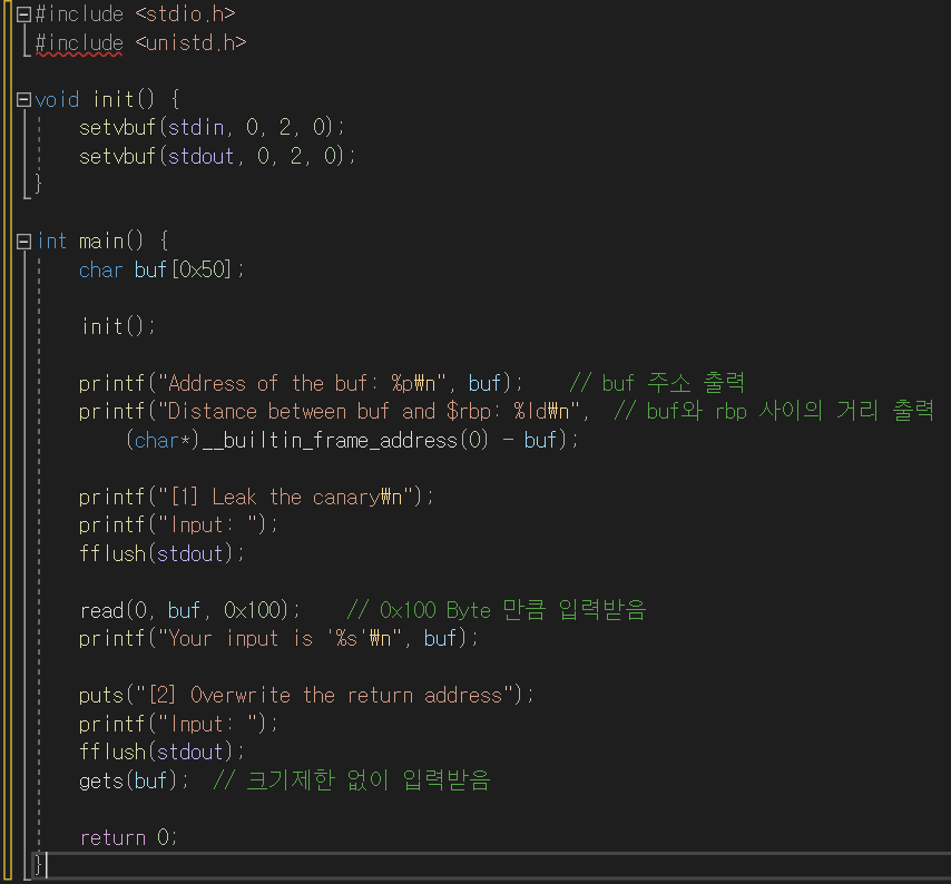 --> 두번 입력받음. 위에서 카나리 알아내고 아래에서 우회