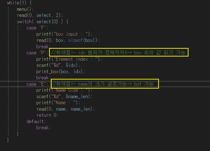 case 'P': //취약점!- idx 범위가 정해지지X-> box 외의 값 읽기 가능